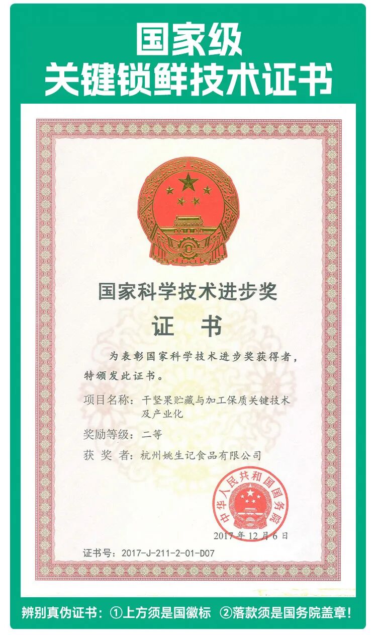 同时,姚生记的干坚果贮藏与加工保质关键技术及产业化项目,荣获国家科学技术进步二等奖。(证书号:2017-J-211-2-01-D07)
